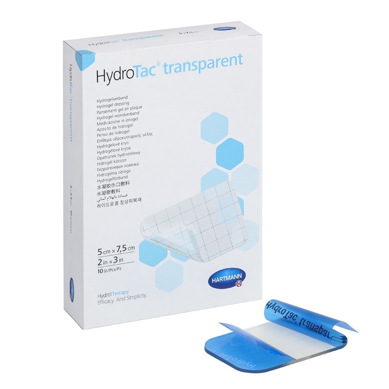 HydroTac Transparent je moderní transparentní hydrogelové krytí z hydratovaného polyuretanu. Ve své struktuře uzavírá molekuly vody. Ty pak uvolňuje do rány, a tím v ní udržuje optimální vlhké prostředí při léčbě rány. Nosná vrstva se skládá z paropropustné polyuretanové fólie neprostupné pro kapaliny a bakterie.